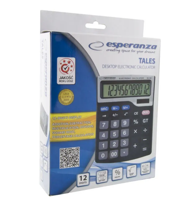 Elektroniczny kalkulator biurkowy z dużym, 12 cyfrowym wyświetlaczem. Posiada wszystkie podstawowe funkcje matematyczne (dodawanie, odejmowanie, mnożenie, dzielenie, pierwiastkowanie, obliczanie procentów), funkcję cofania wpisywanych cyfr oraz możliwość zapamiętywania wyników. Pochylony wyświetlacz, duże wyświetlane cyfry oraz duże klawisze ułatwiają pracę z kalkulatorem. Idealny do codziennego użytku w sklepach i biurach.